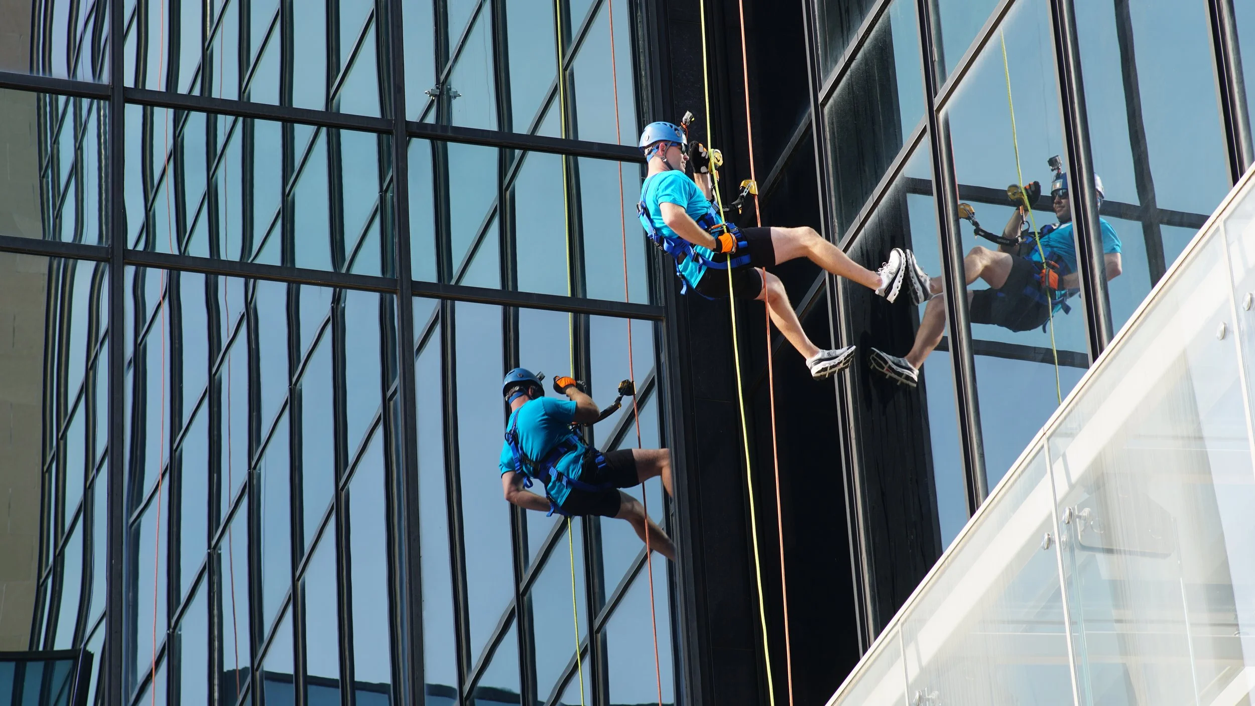 Team members fundraise together and rappel together